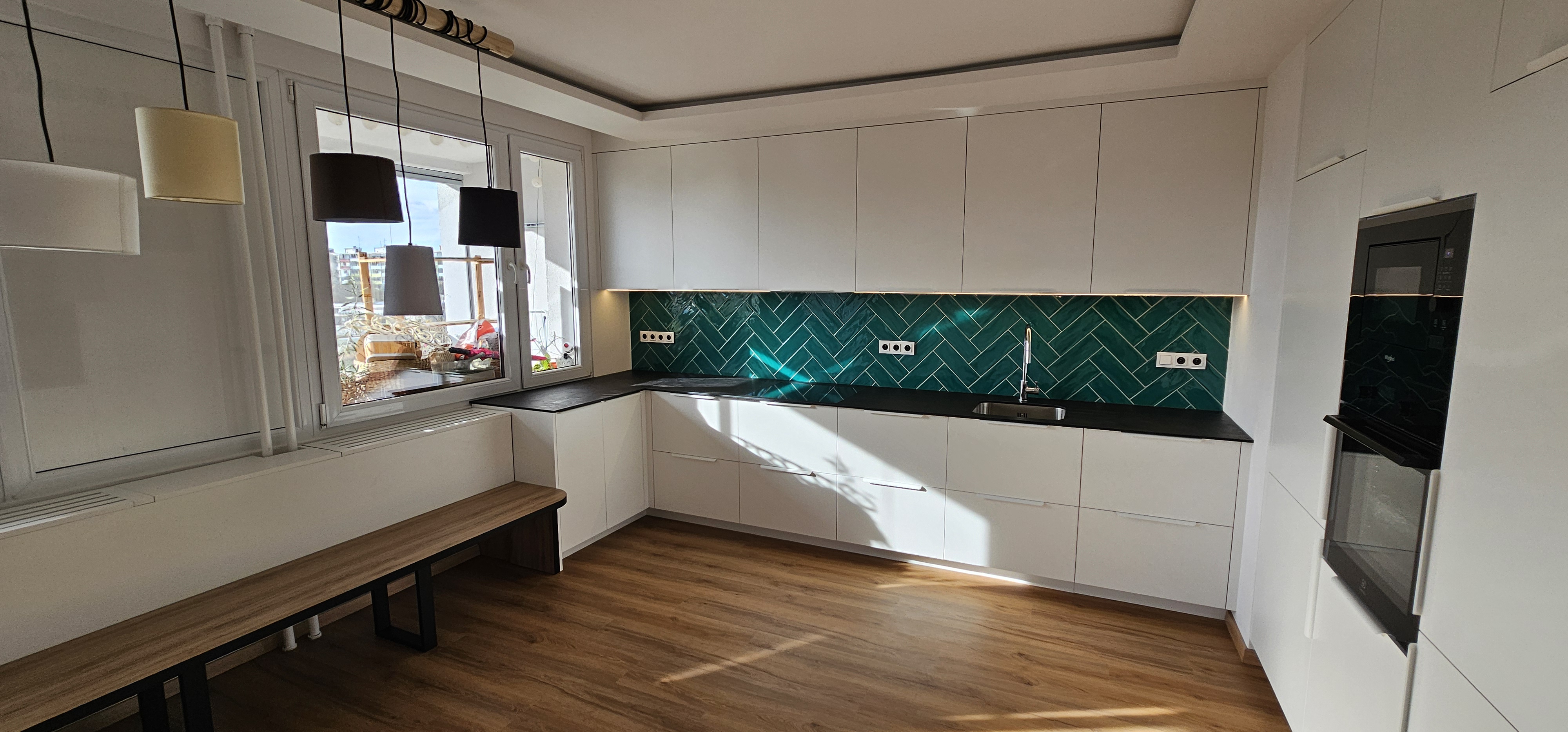 Kompletní rekonstrukce bytu vč. změny dispozic příček, obklady, dlažby, vinylová podlaha, dveře Sapeli, truhlářské výrobky atd.